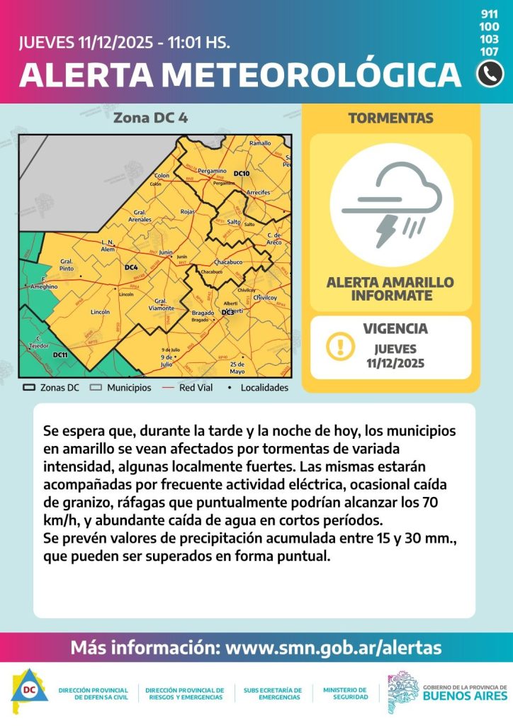 General Viamonte — El Servicio Meteorológico Nacional emitió una alerta amarilla por tormentas que afectará a varios municipios de la provincia de Buenos Aires, incluido General Viamonte, durante la tarde y la noche de este jueves 11 de diciembre.