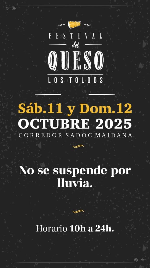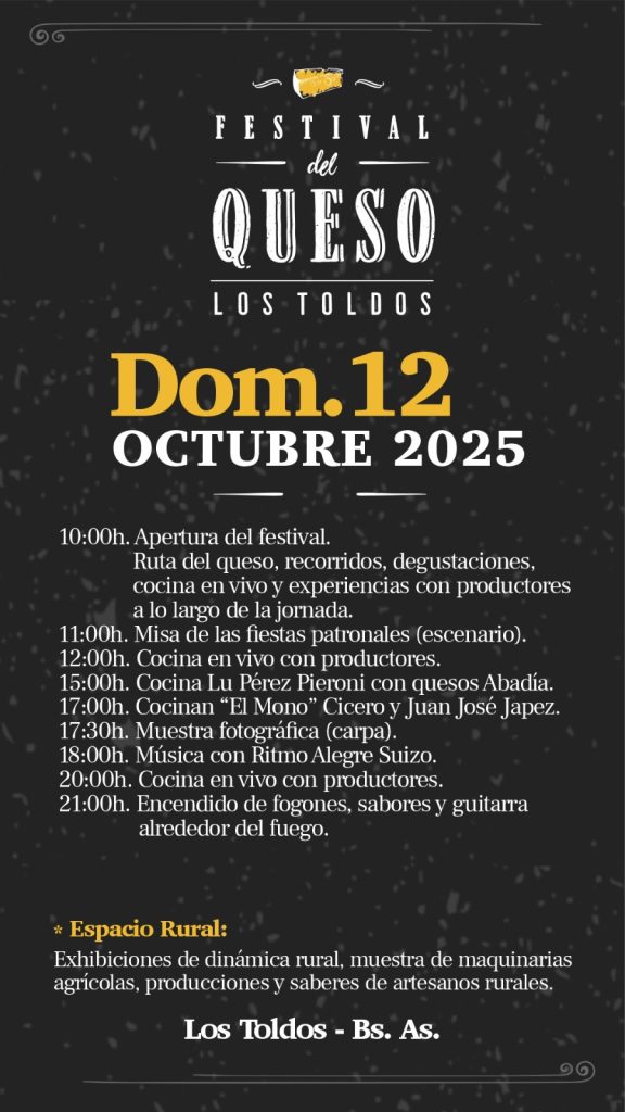 Este sábado 11 y domingo 12 de octubre, Los Toldos será sede del esperado Festival del Queso 2025, una celebración que reúne lo mejor de la producción quesera local con propuestas gastronómicas, culturales y rurales para disfrutar en comunidad.